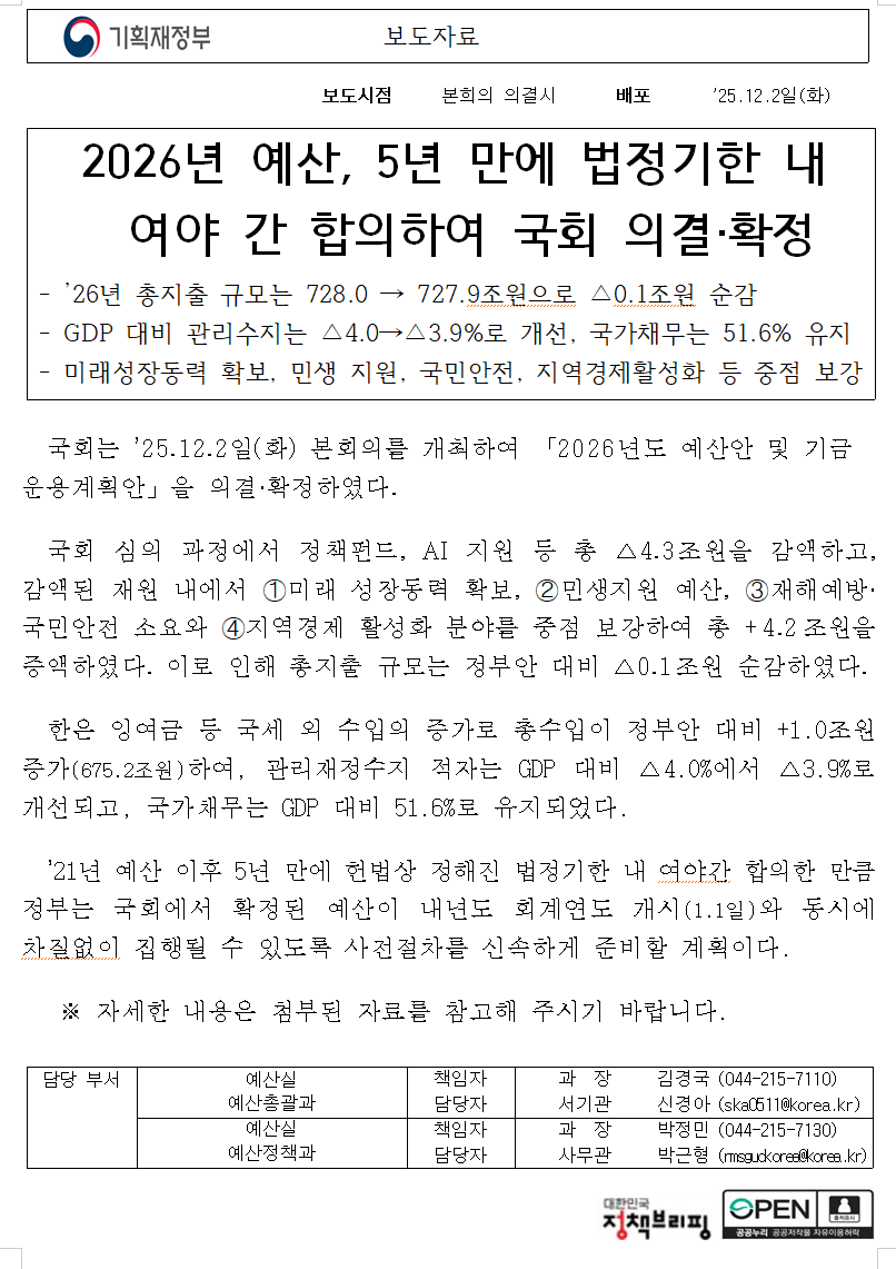 「2026년도 예산안 및 기금운용계획안」을