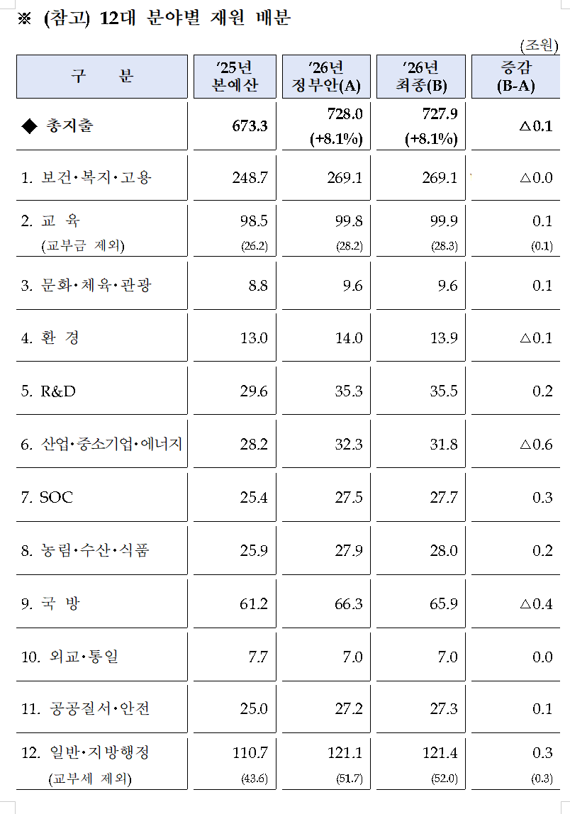 - 2026년 총지출 규모는 728.0 → 727.9조원으로