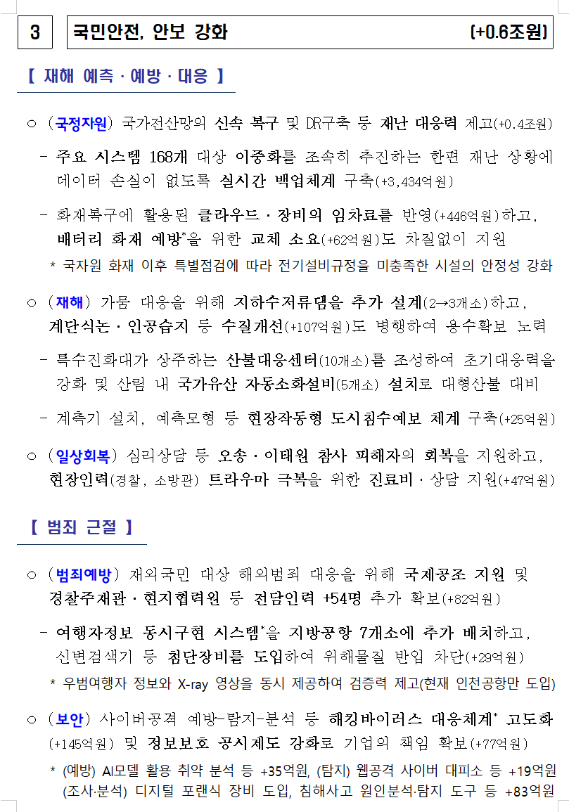 - 미래성장동력 확보, 민생 지원, 국민안전,