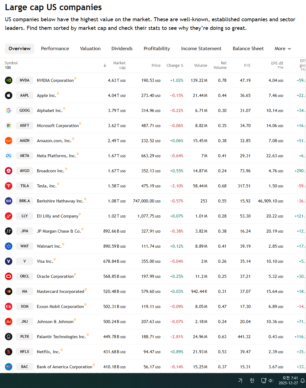 | 2025년 12월 24일 금융시장 지표와 미국증시 시가총액 순위 (0) | 2025.12.25 |