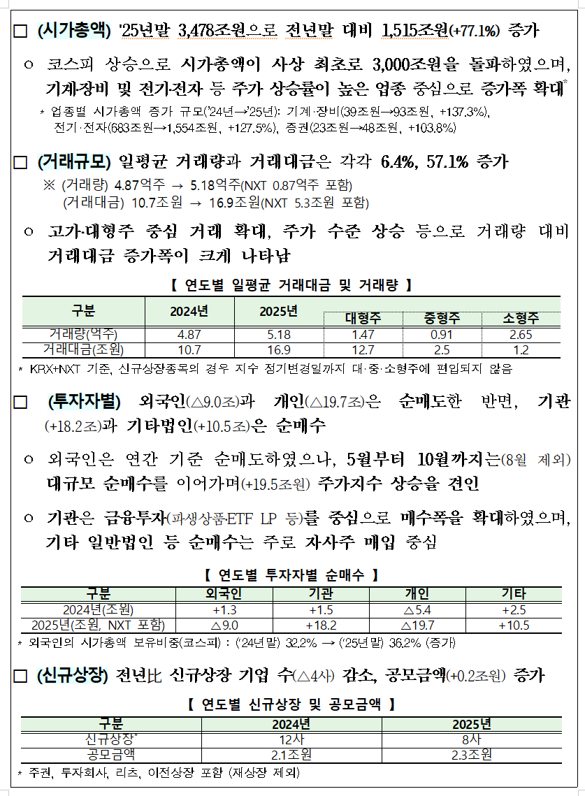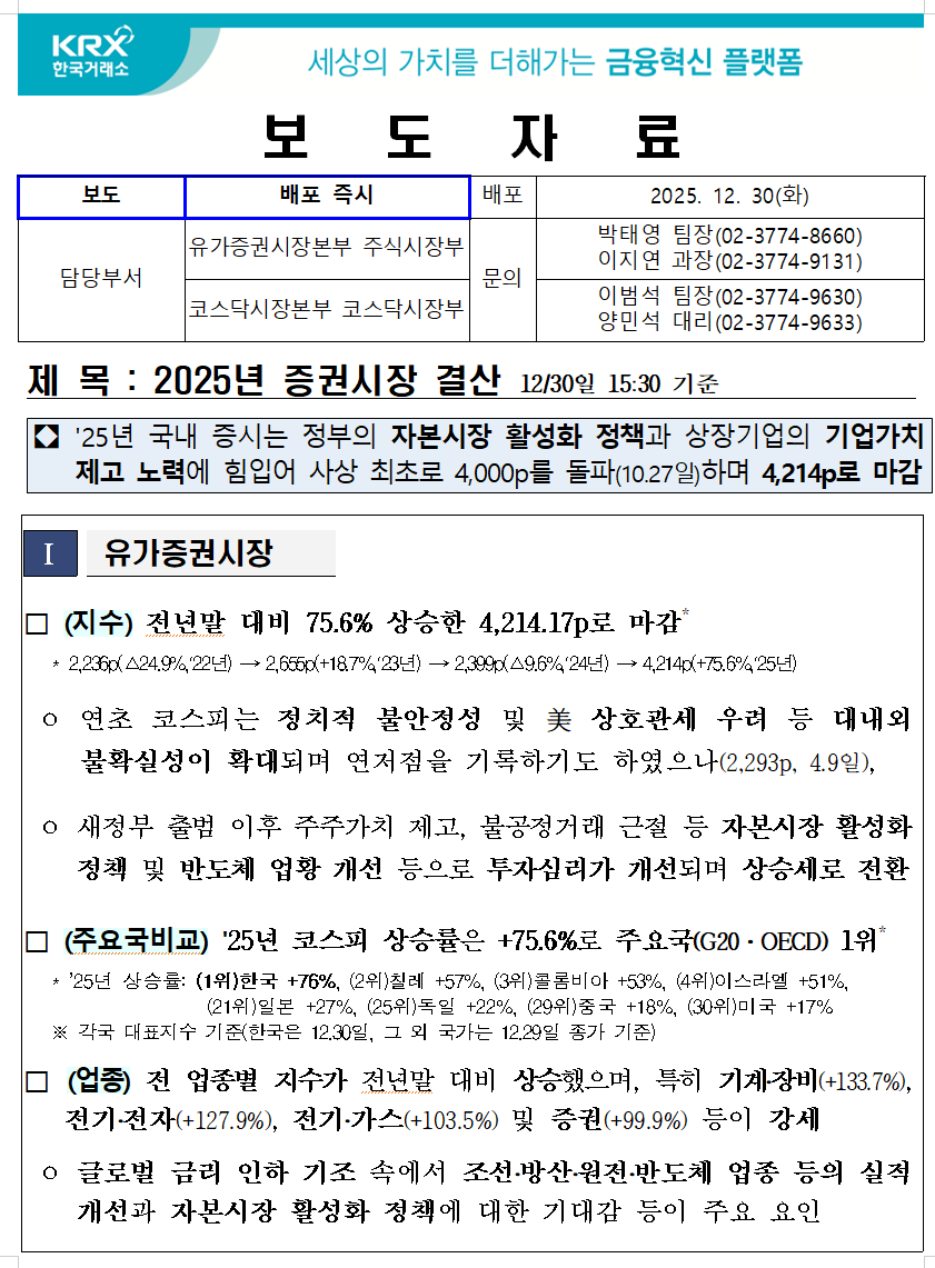 | 2025년 거래소(코스닥) 등락률 상위기업과 2025년 거래소(코스닥) 시가총액 상위기업 변화 및 2025년 그룹별 시가총액 변화 및 2025년 주요국 주가상승률 (0) | 2025.12.31 |