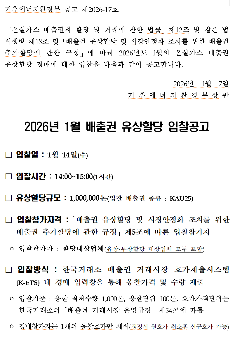 2026년 1월 배출권 유상할당 입찰공고 및
