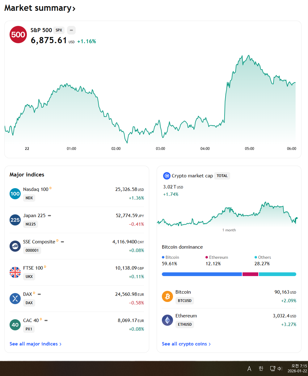 | 2026년 1월 22일 목요일 증시현황 (0) | 2026.01.22 |