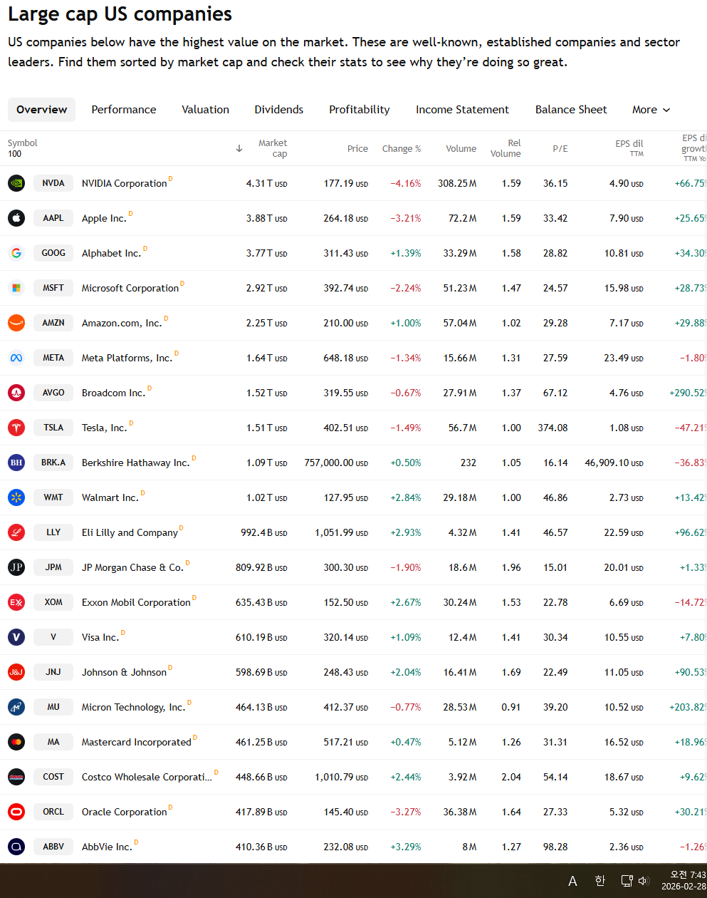 | 2026년 2월 25일 금융시장 지표와 미국증시 시가총액 순위 (0) | 2026.02.26 |