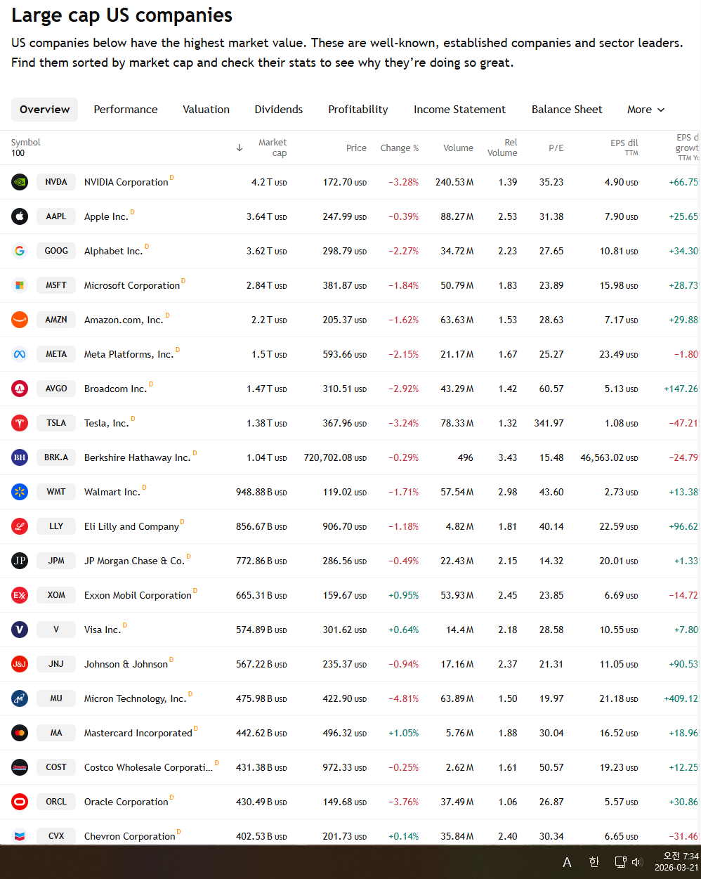 | 2026년 3월 19일 금융시장 지표와 미국증시 시가총액 순위 (0) | 2026.03.20 |