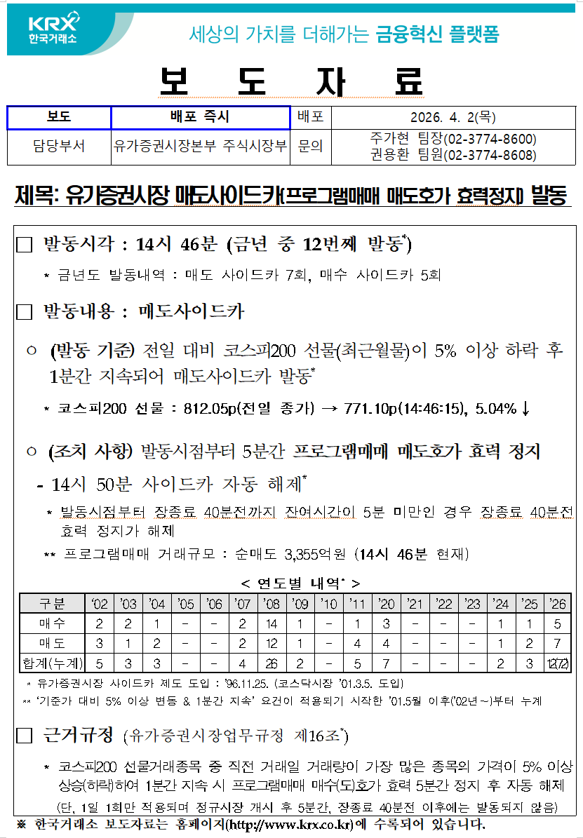 * 2026년도 발동내역 : 매도 사이드카 7회,