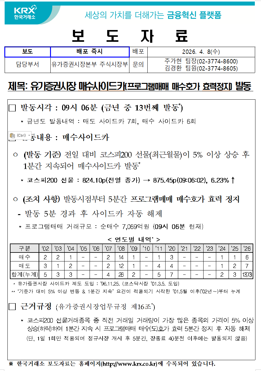 * 2026년도 발동내역 : 매도 사이드카 7회,