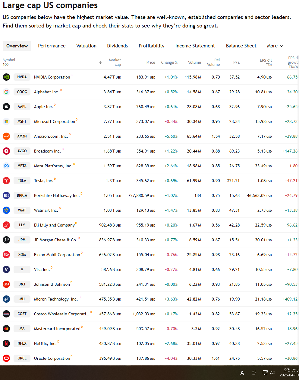 | 2026년 4월 8일 금융시장 지표와 미국증시 시가총액 순위 (0) | 2026.04.09 |