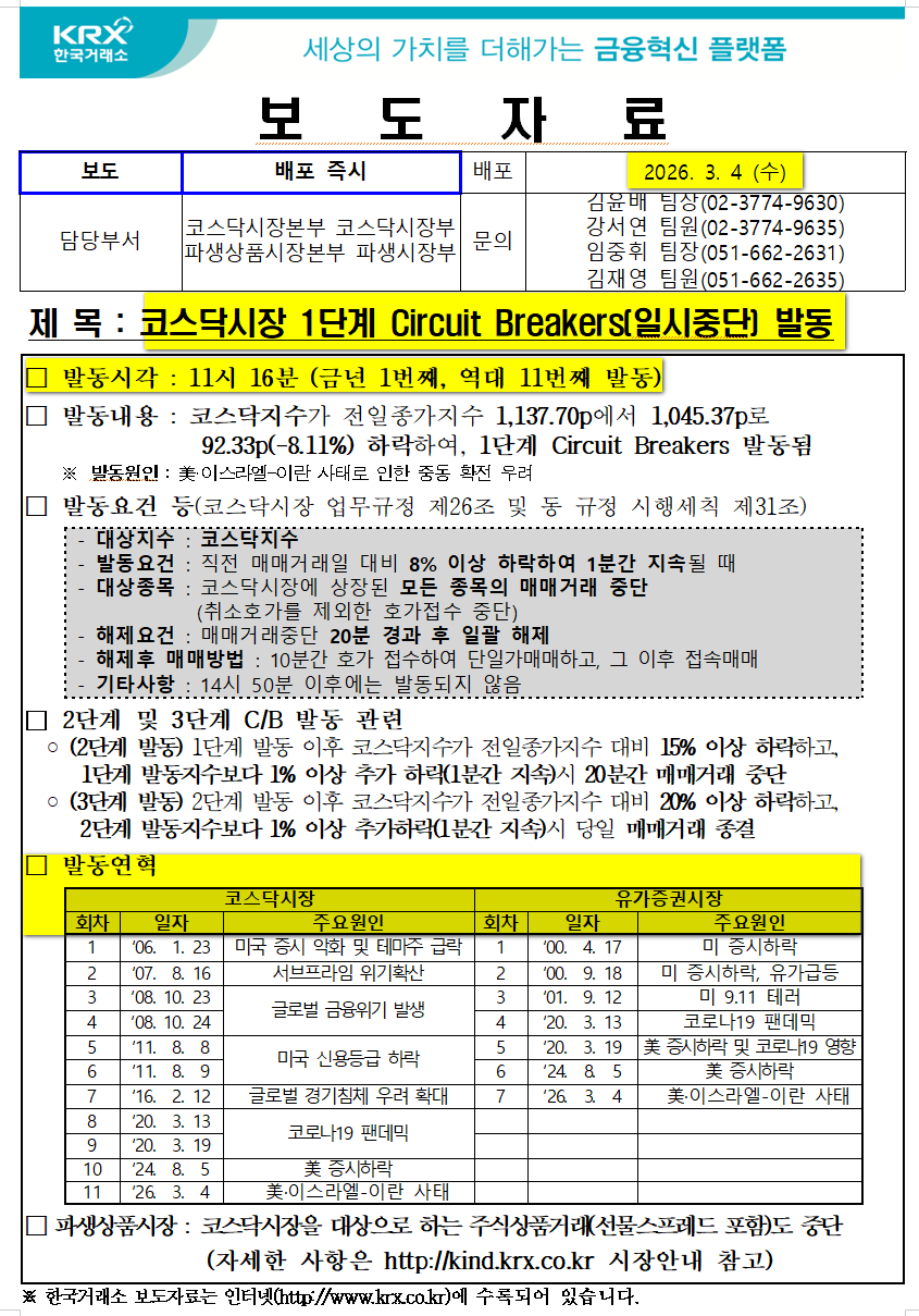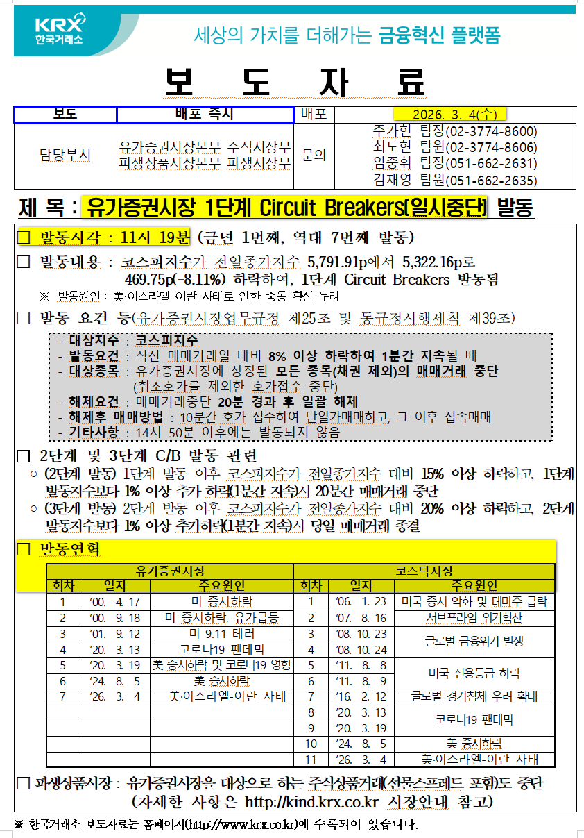 | 2026년 2월 4일 수요일, 거래소(KOSPI) 및 코스닥(KOSDAQ) 시장 1단계 Circuit Breakers(일시중단) 발동 (0) | 2026.03.04 |