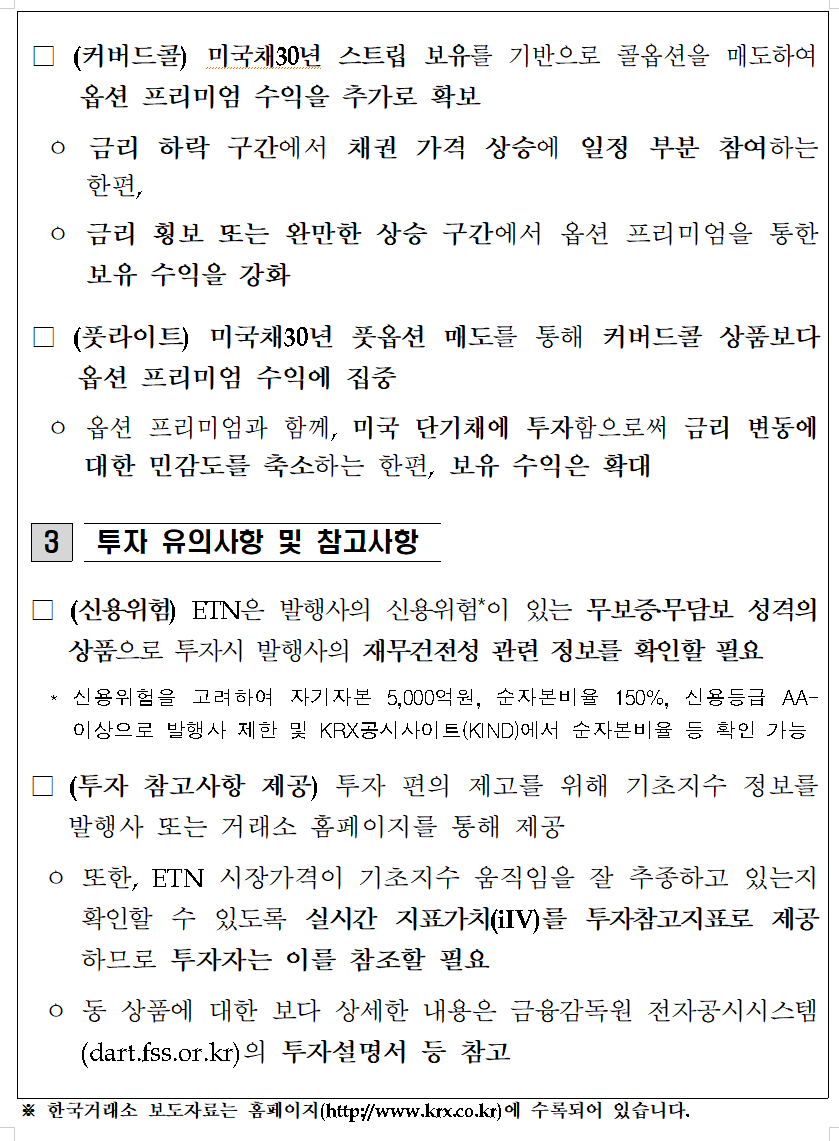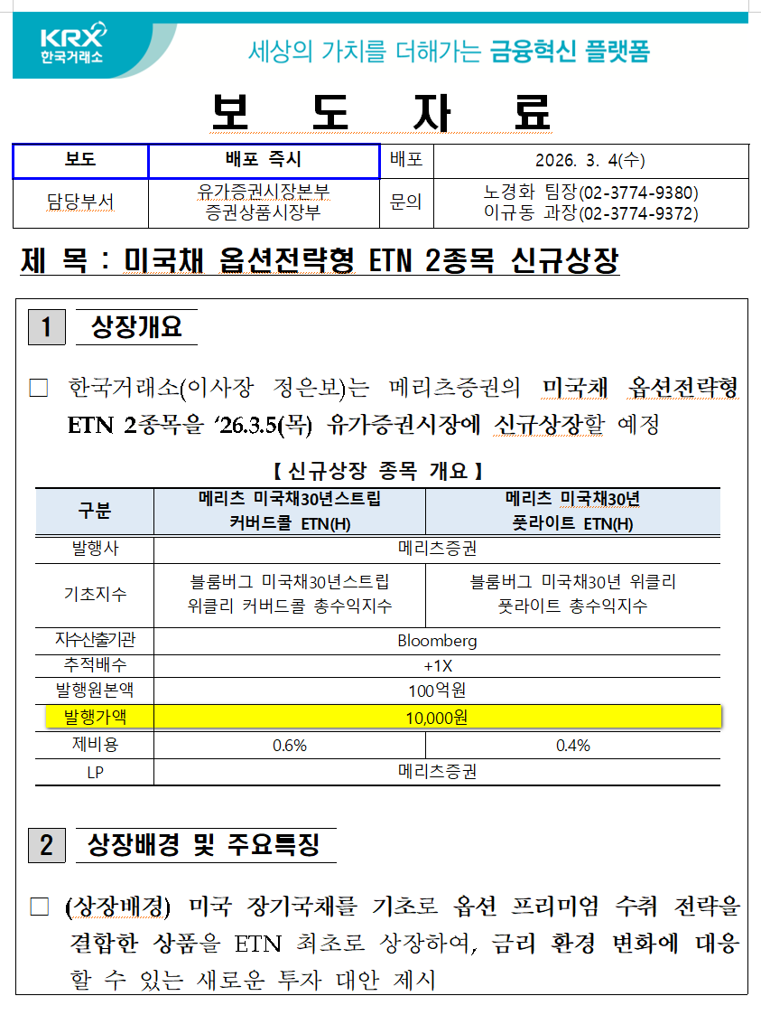 | 메리츠 미국채30년스트립 커버드콜 ETN(H), 메리츠 미국채30년 풋라이트 ETN(H), 거래소 신규상장(2026년 3월 5일) (0) | 2026.03.04 |