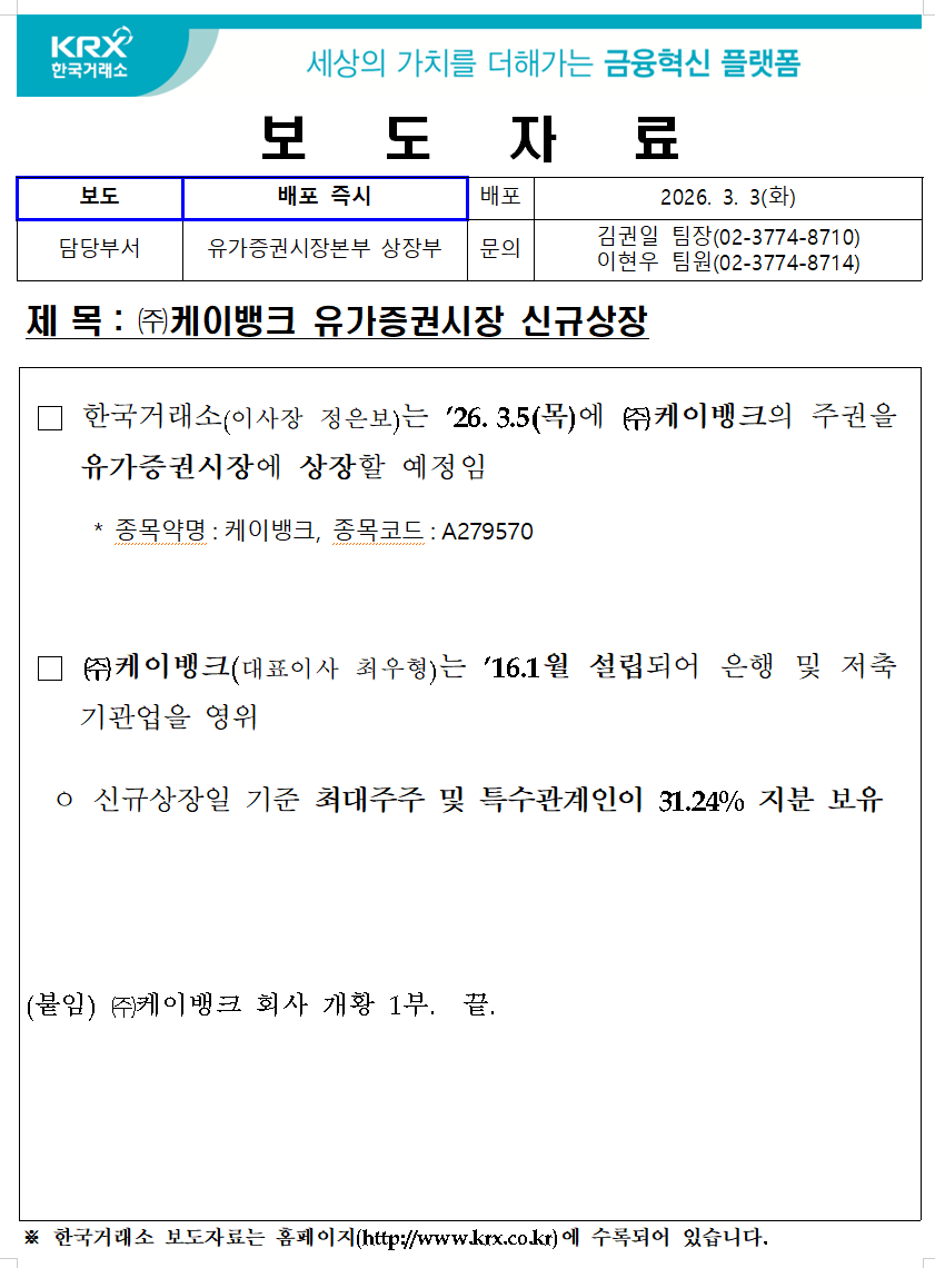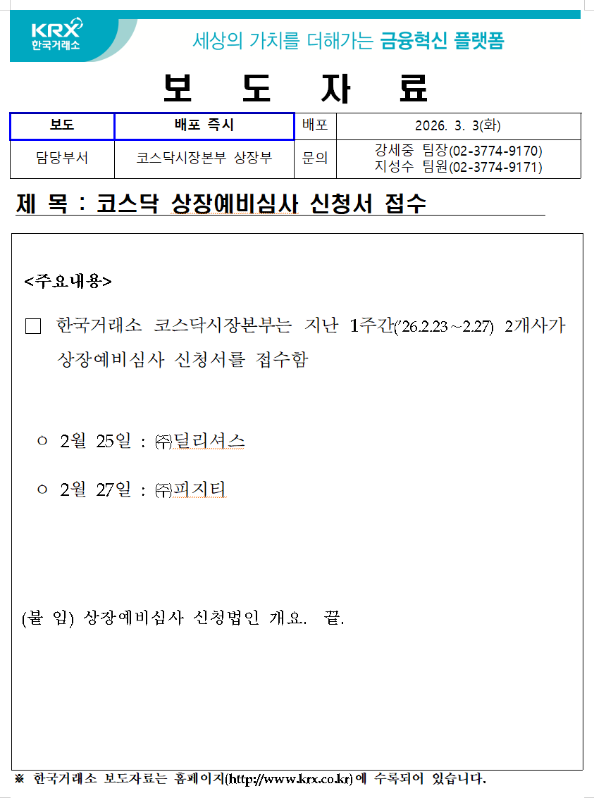 | 에스팀(458350), 코스닥시장 신규상장(2026년 3월 6일) (0) | 2026.03.05 |