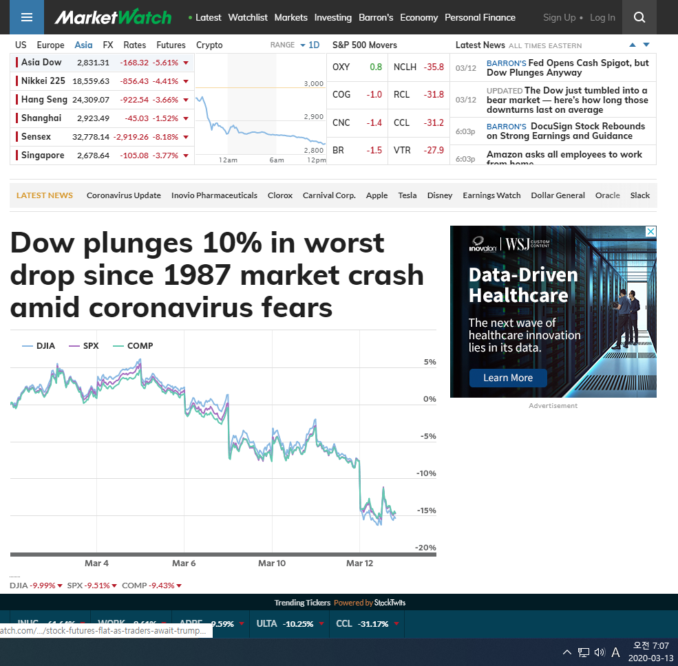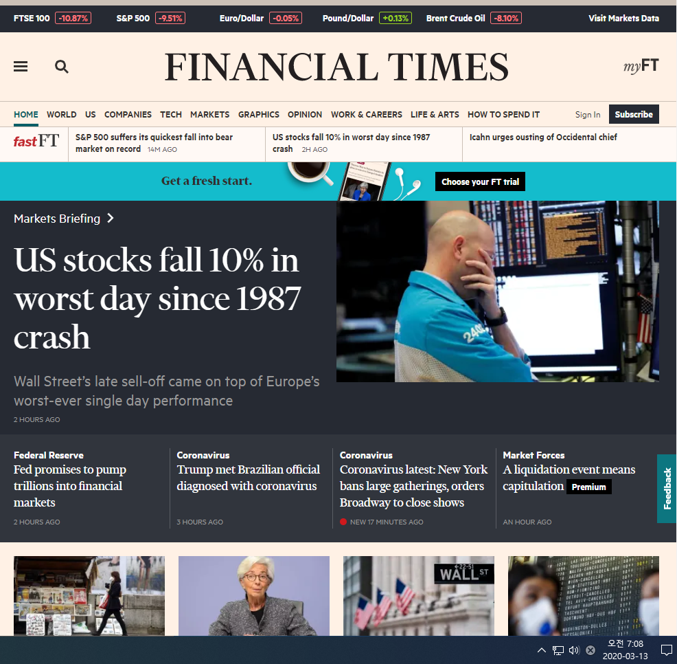 2020년 3월 12일, bloomberg, reuters, marketwatch, FT, 첫화면과 네이버 경제 소식